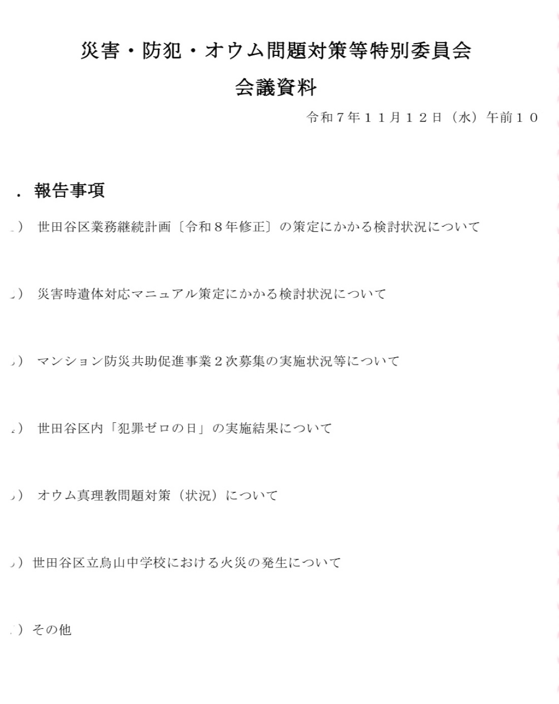11/12、所属している災害・防犯・オウム問題対策等特別委員会の会議に出席。